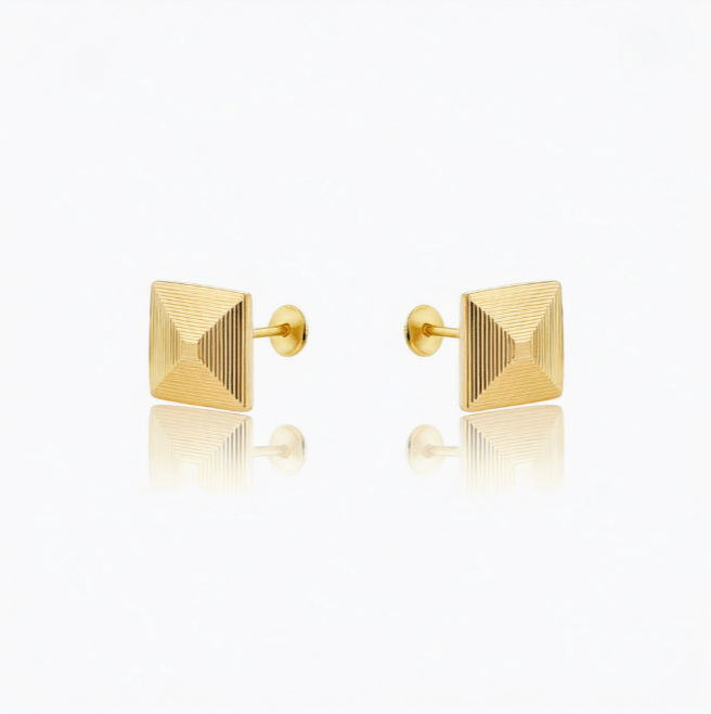 - Design: Pyramid-shaped stud with engraved stripes